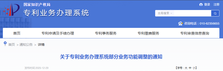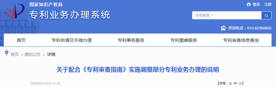 为保障《国家知识产权局关于修改<专利审查指南>的决定(局令第84号)》及《国家知识产权局关于全面实施以可扩展标记语言格式提交专利电子文件相关事宜的通知》相关工作顺利开展,专利业务办理系统网页版和客户端将于2026年1月1日0时进行系统更新,对部分功能进行调整,具体内容如下: ……【详细】